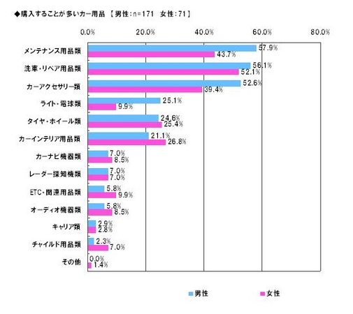 また、購入することが多いカー用品を複数回答形式で聞いたところ、男性でトップになったのは「メンテナンス用品類」57.9%、2位「洗車・リペア用品類」56.1%、3位「カーアクセサリー類」52.6%に対し、女性は1位「洗車・リペア用品類」52.1%、2位「メンテナンス用品類」43.7%、3位「カーアクセサリー類」39.4%となり、男女で、自家用車に対するこだわり方が異なることが明らかになりました。