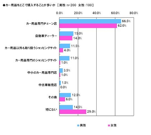 カー用品の購入場所を複数回答形式で聞いたところ、男女ともに「カー用品専門チェーン店」の回答が圧倒的に多くなり、男性では66.5%、女性では62.0%という結果になりました。2位以下の回答の順位についても、男女間で差がなく、2位は「自動車ディーラー」(男性:15.0%/女性:14.0%)、3位「カー用品以外も取り扱うショッピングサイト」(男性:11.5%/女性:4.0%)となりました。