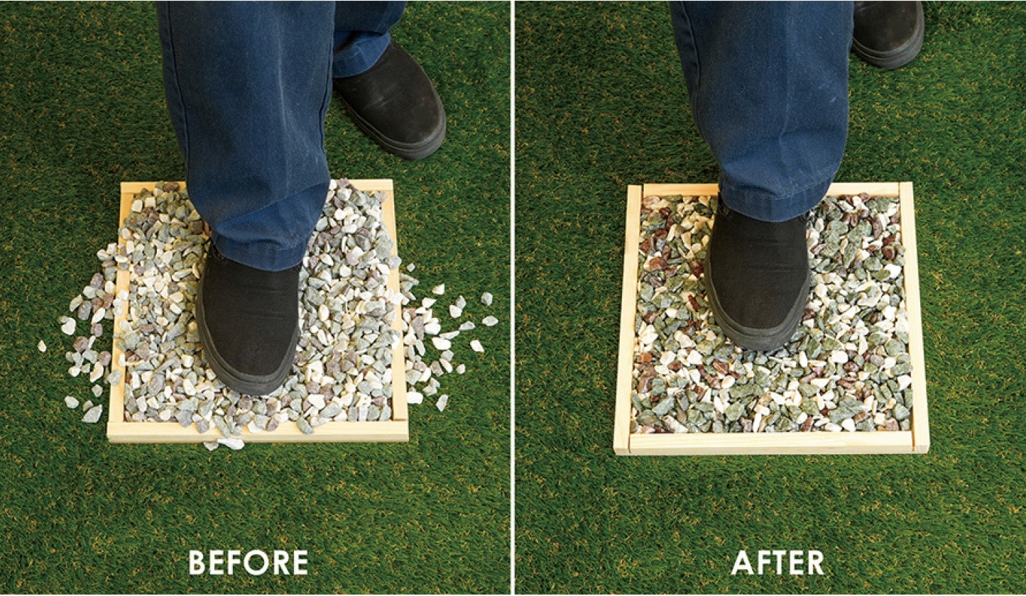 「砂利を固める水性接着剤」は、小砂利同士をしっかりと接着し、歩行や風雨による散乱を防止します。固められた砂利面は安定性が増し、落ち葉やゴミが表面に溜まっても簡単に掃き掃除ができるため、従来のように砂利の間に入り込んだ枯葉を一つひとつ取り除く必要がありません。