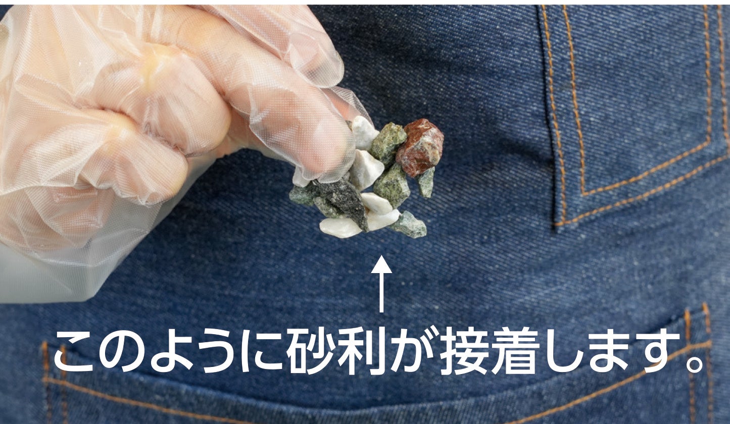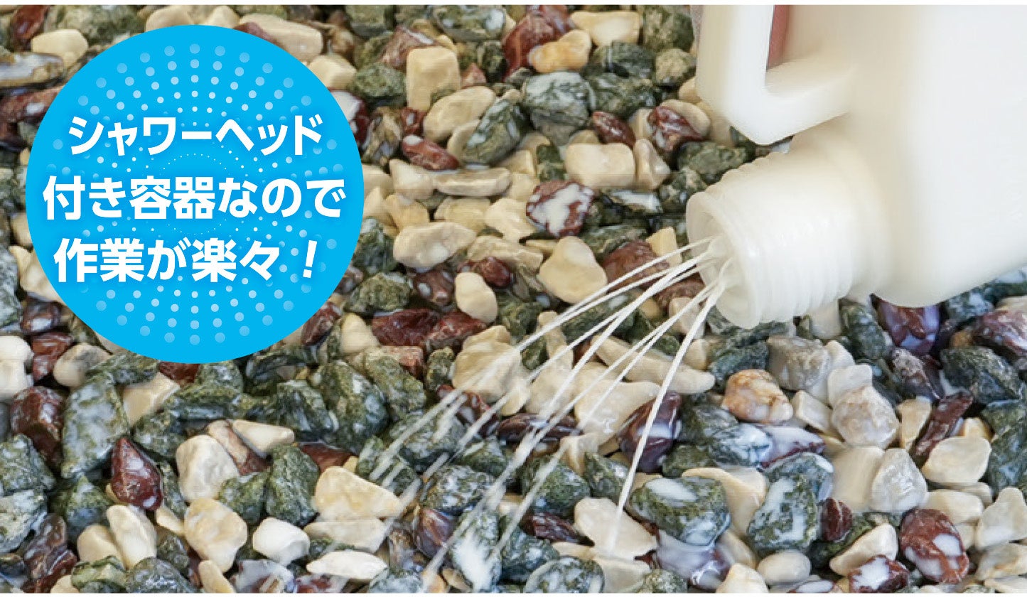 シャワーヘッド付き容器を採用しており、シャワー状に散布できるため、広範囲でも均一に施工が可能です。力を入れる必要がなく、誰でも簡単に扱える設計となっています。推奨小砂利サイズは9~15mmで、一般的な砂利に対応できます。施工後は透明クリアに仕上がるため、砂利本来の意匠性や色合いを損なうことなく、美しい景観をそのまま維持できます。