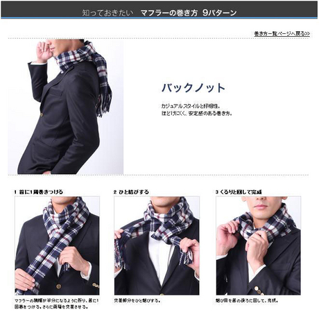 巻き方のバリエーションを掲載することで、マフラーをドレスアップアイテムとしても提案しています。すぐに出来る簡単なスタイルを中心にワンループ、ひとえがけ、ループクロスを始め、写真と文章で丁寧に巻き方をご案内しております。