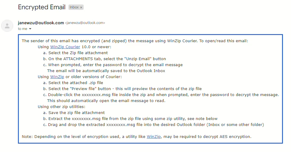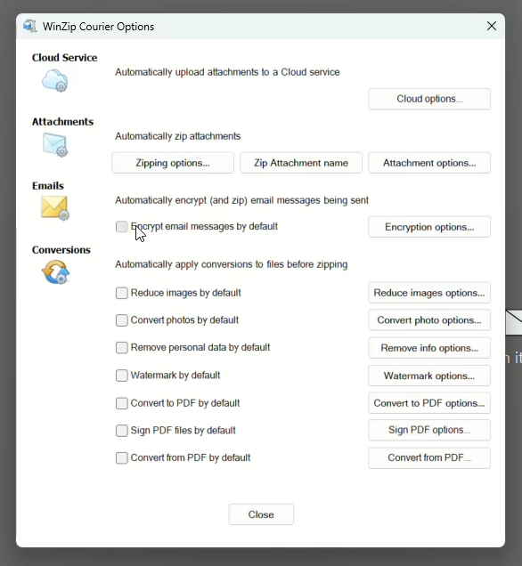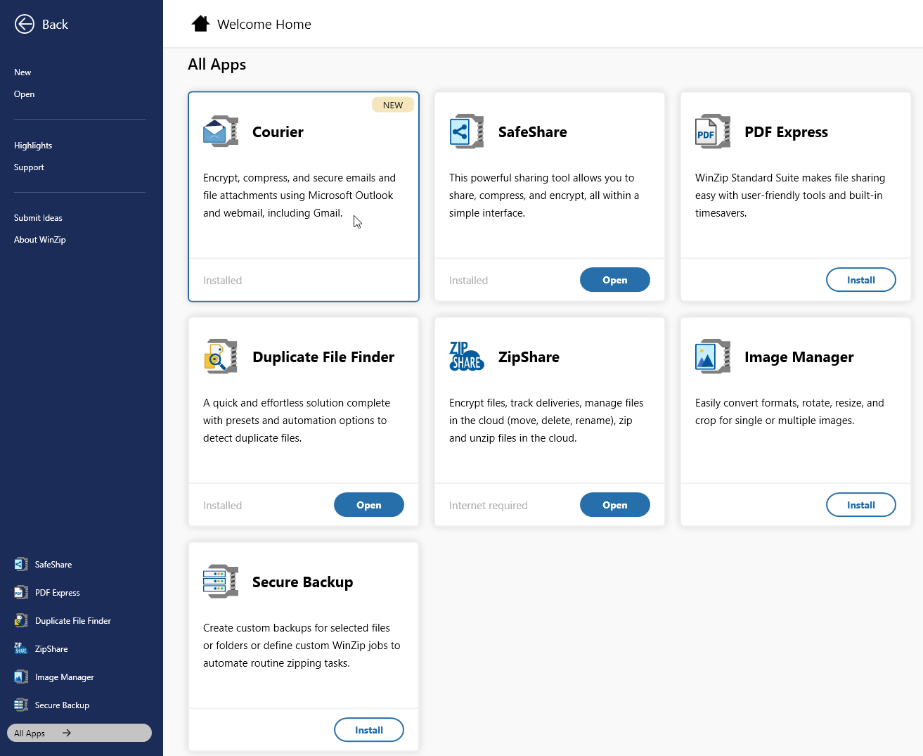 · 電子メール保護の統合: WinZip Enterprise ユーザーは、WinZip Courier を Microsoft Office、Outlook、その他の Web メール サービスとより簡単に連携できるようになりました。さらに、ホーム画面上でWinZip Courierに関するすべての重要な情報を見つけることができます。この統合により、WinZip EnterpriseユーザーはWinZip Courierの堅牢な機能に直接アクセスでき、電子メールや添付ファイルを簡単に暗号化してセキュリティを強化し、スムーズなコミュニケーションを実現できます。