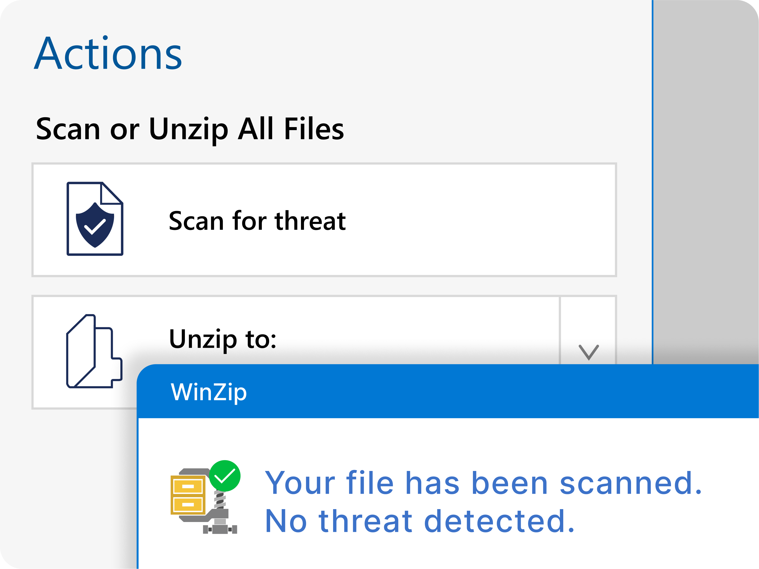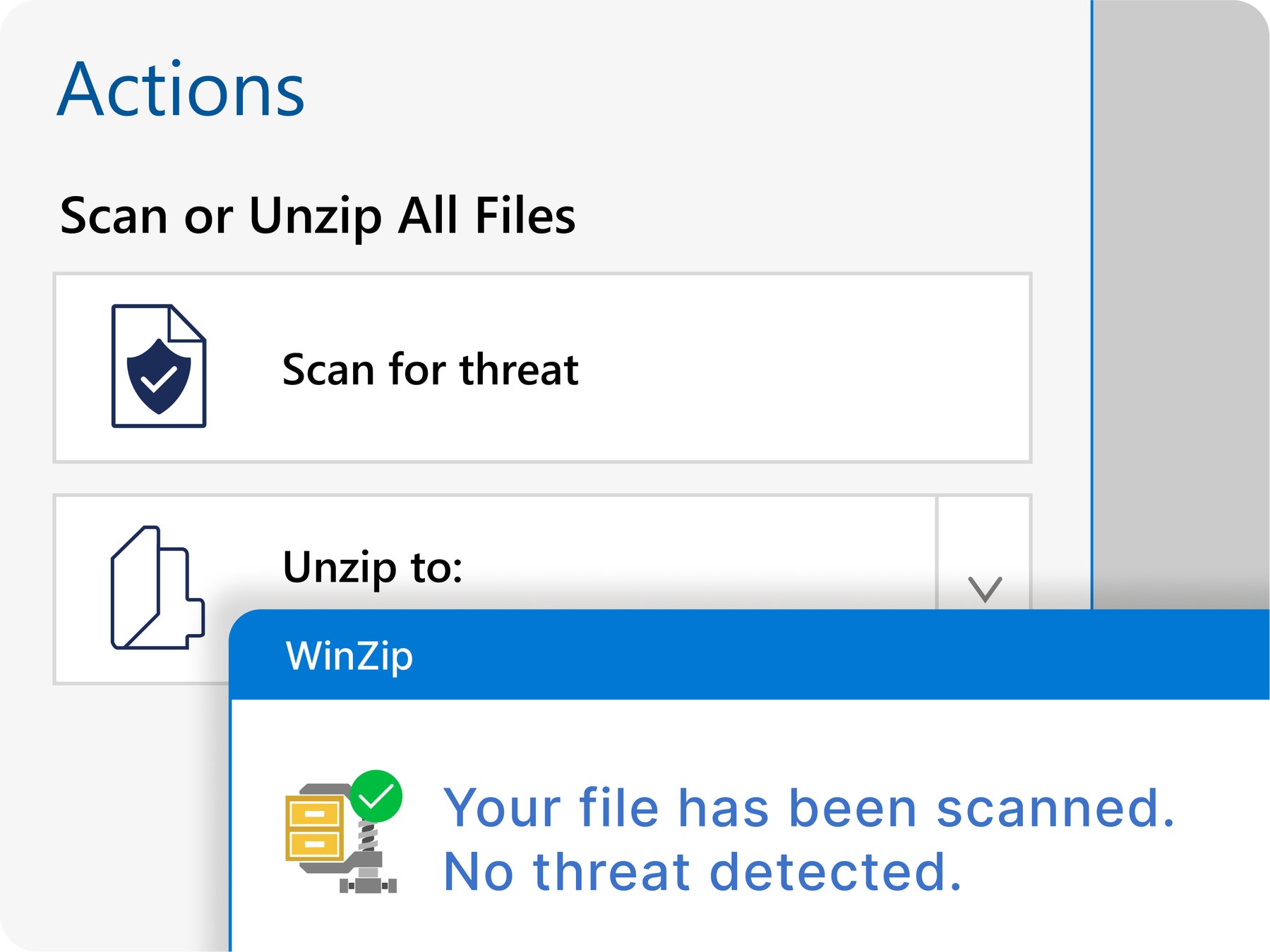 · 脅威に対するファイルスキャン: WinZipの最新バージョンでは、暗号化の有無にかかわらずzipファイルを開く前に簡単にウイルススキャンできるようになりました。既存のウイルス対策ソフトを活用するこの新しいスマート機能により、マルウェアやランサムウェアなどの有害な脅威からデバイスを保護しデータの安全を確保します。これにより、ウイルスに感染することなくファイルを開くことができ、デジタルセキュリティと全体的な利便性が向上します。