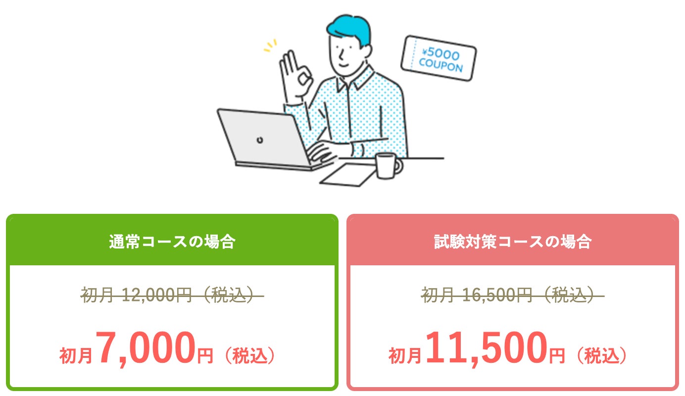 有料会員登録で、月額受講料(1ヶ月分)から5,000円をキャッシュバックするクーポンコードがもらえます。