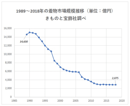 着物を着る人は年々減り、1989年の着物市場規模は約1.5兆円あったのが、2018年には約2,900億円と、1989年の1/5にまで減少しています。
