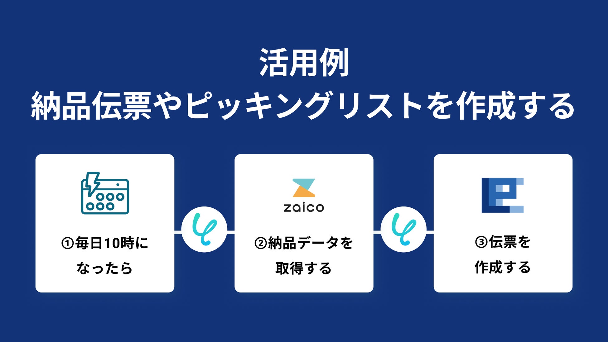 zaicoなどの在庫管理ツールと連携し、納品データから納品伝票やピッキングリストを作成することが可能です。