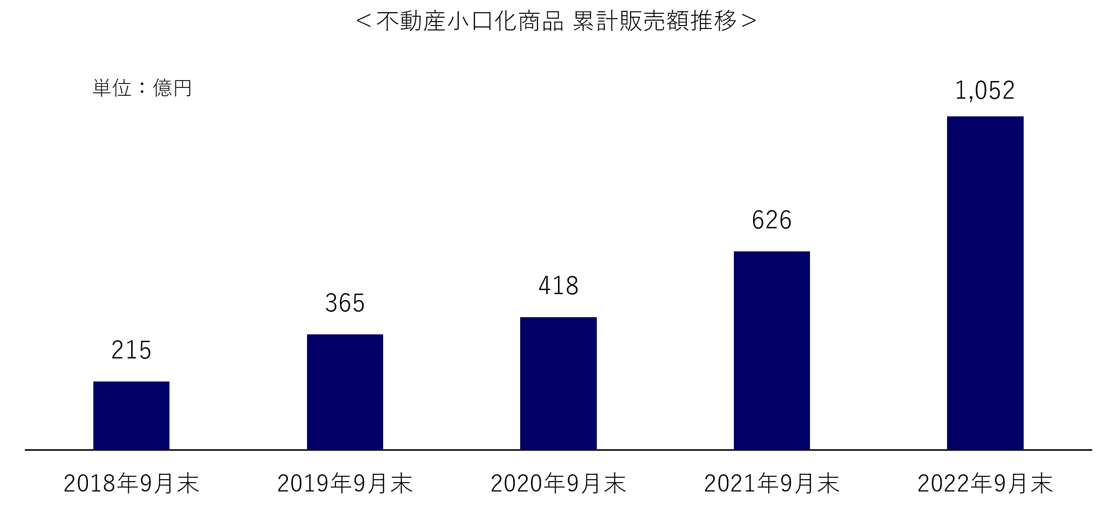 当社は、お客様からの旺盛な需要に応えるため、組成用不動産を積極的に取得することにより、組成と販売の好循環を確立させ、その結果、2022年9月末日時点における当社の不動産小口化商品の累計販売額が1,000億円を突破いたしました。