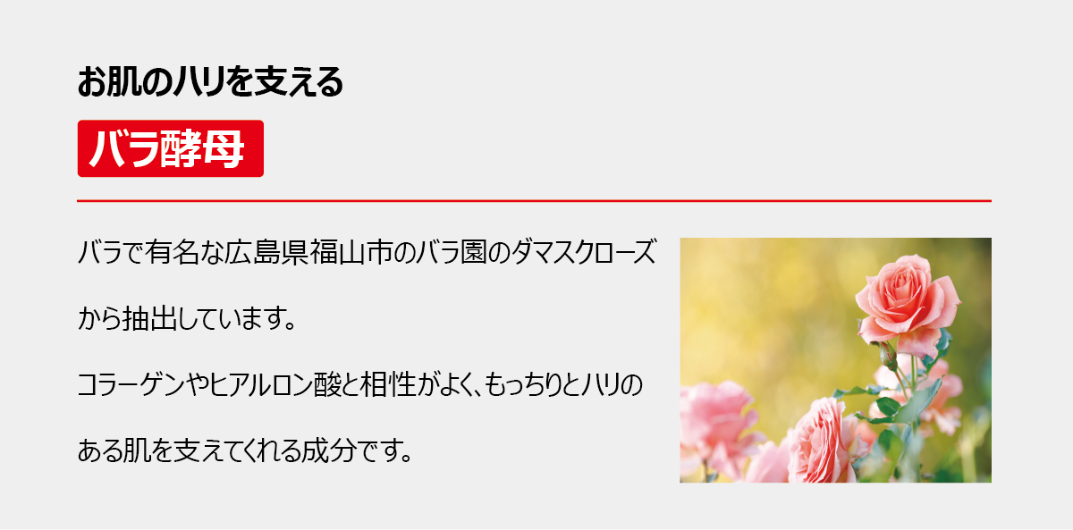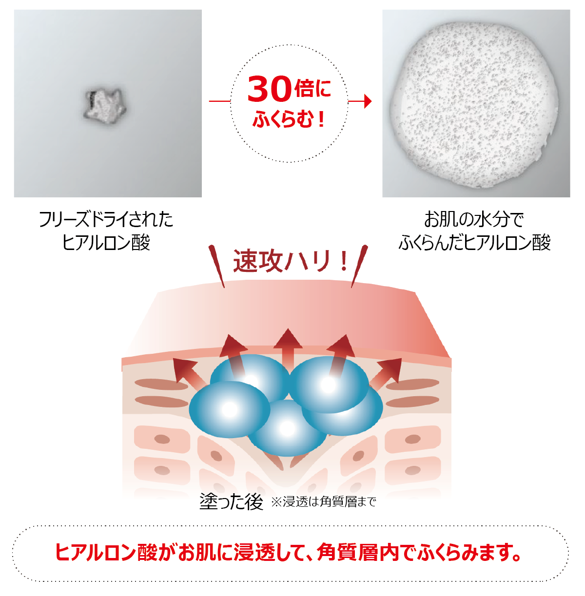 ヒアルロン酸を最新のフリーズドライ技術でフレッシュなまま小さくしました。お肌の水分を含んでふくらみ、ハリと弾力を与えます。