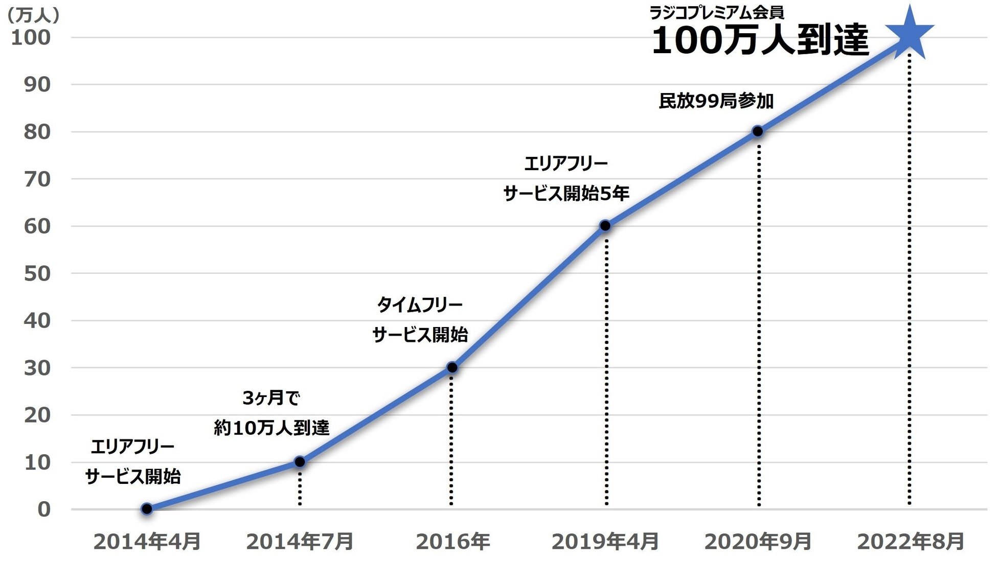 『ラジコプレミアム』は、月間ユニークユーザーが900万人に達するラジオ配信プラットフォーム「radiko」(https://radiko.jp/)で配信している民放ラジオ全99局のラジオ番組を日本全国どこででも聴くことができる月額385円(税込)の有料サービスです。“エリアの枠を超えてラジオを聴取したい”というユーザーの声を受けてスタートした『ラジコプレミアム』は、2014年4月のサービス開始からわずか3か月で、会員数10万人に到達。その後も順調に会員数を増やし、8年5カ月目の2022年8月、100万人に到達しました。