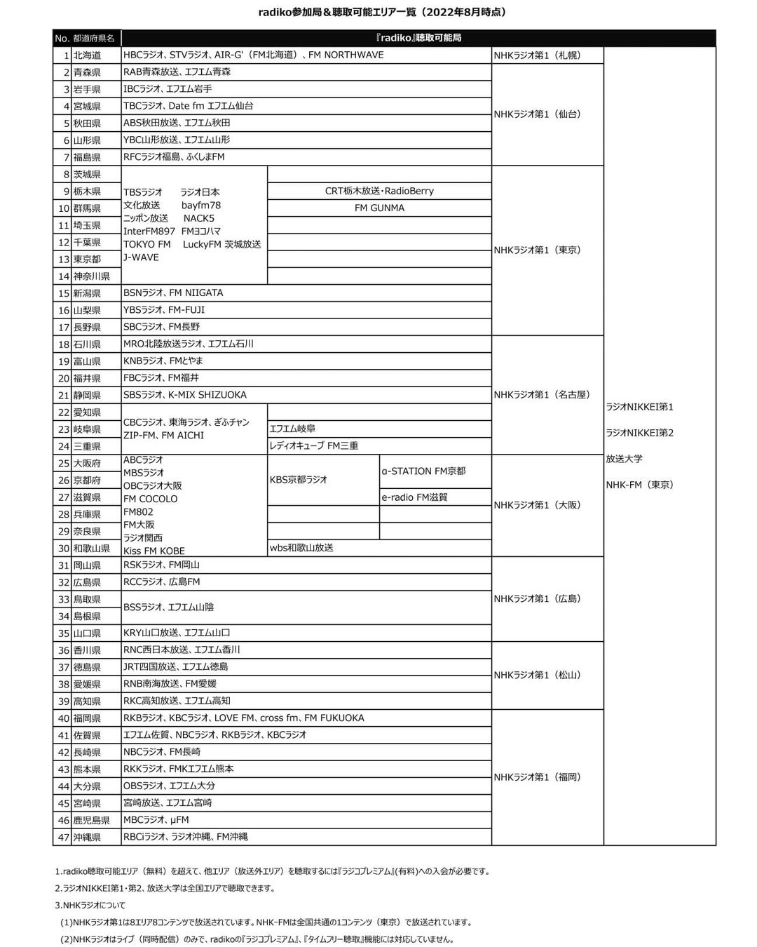 - radiko参加局&聴取可能エリア一覧 (2022年8月時点)