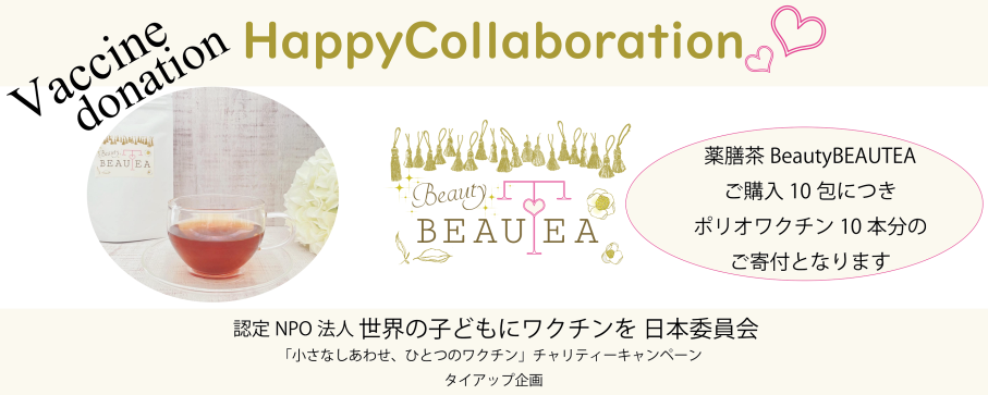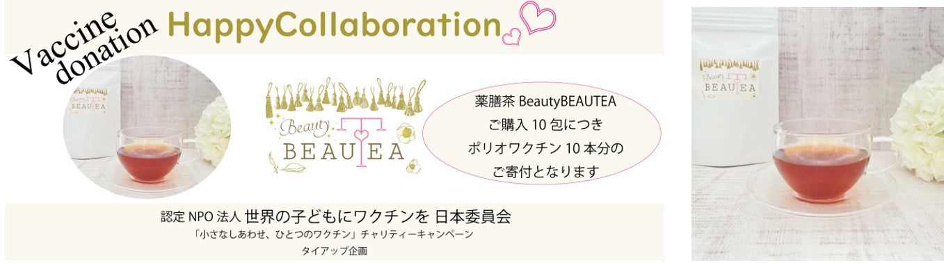 またキャンペーンに合わせて、キャンペーン協賛企業・団体のひとつ一般社団法人インターナショナルエキスパート総合協会では、支援の輪をさらに広げるために、開催期間中の9/5(月)~10/9(日)、商品にハートモチーフのある薬膳茶 「Beauty BEAUTEA」10包が販売される毎に、ポリオワクチン10人分の支援につながる「Happy Collaboration」も実施し活動を後押しします。(Beauty BEAUTEA 販売サイト:https://iega.stores.jp)