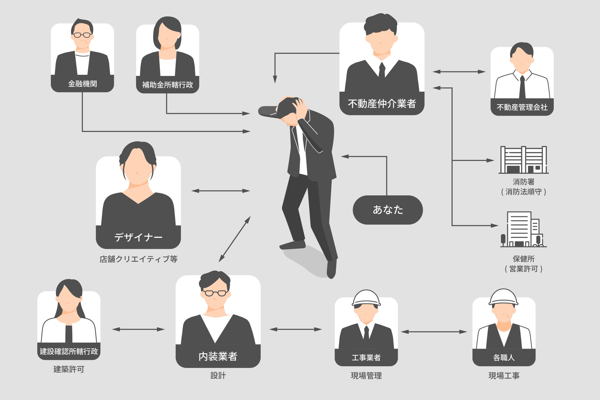 顧客・社内の他担当者をはじめ、物件管理会社・各関係法令所轄機関(消防署・保健所など)・補助金および融資担当の金融機関等、多岐に渡る関係各所とのストレスの無い連携を叶えます。