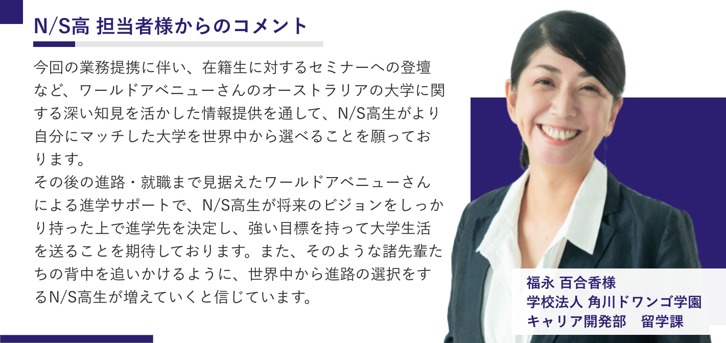 オーストラリアは、日本との時差が少なく安全性や教育水準の高さから海外留学先として人気の高い国の一つです。N/S高においてもオーストラリアへの留学を希望する生徒が増えていることから、ワールドアベニューとの業務提携が実現しました。
