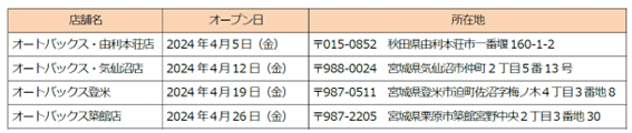 今回の4店舗出店により、東北エリア6県におけるオートバックス・スーパーオートバックス店舗は51店舗となります。