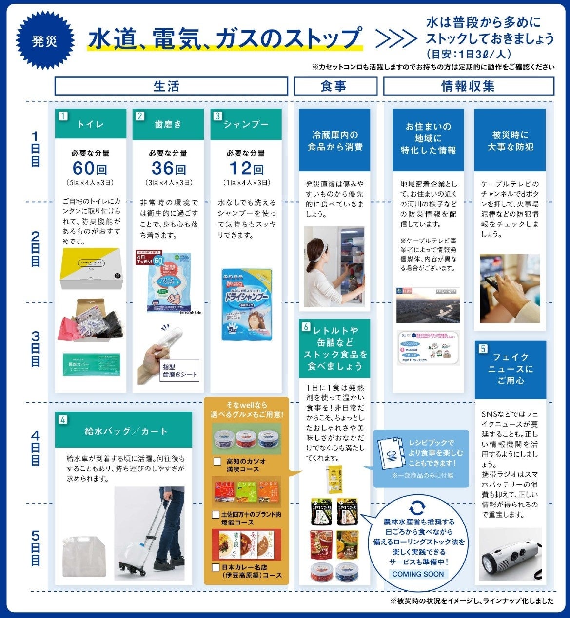 イッツ・コミュニケーションズ株式会社(本社:東京都世田谷区 代表取締役社長:金井美惠 以下、イッツコム)と株式会社ケーブルテレビ品川(本社:東京都品川区 代表取締役 執行役員社長:橋本夏代 以下、ケーブルテレビ品川)と株式会社伊豆急ケーブルネットワーク(本社:静岡県熱海市 代表取締役社長 三井大峰 以下、伊豆急ケーブルネットワーク)は、災害対策に関わる社会課題解決をミッションにした防災サービス提供の一環として、在宅避難を想定した災害対策セット『そなwell』(そなウェル)の期間限定販売を実施いたします。
