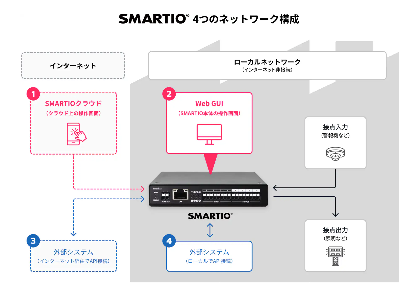 SMARTIOは、デバイスとクラウドサービスが存在します。 LAN内(WiFi)の利用なら、SMARTIOデバイスのみで実現可能、回線費やクラウド利用料などのランニングコストが不要です。