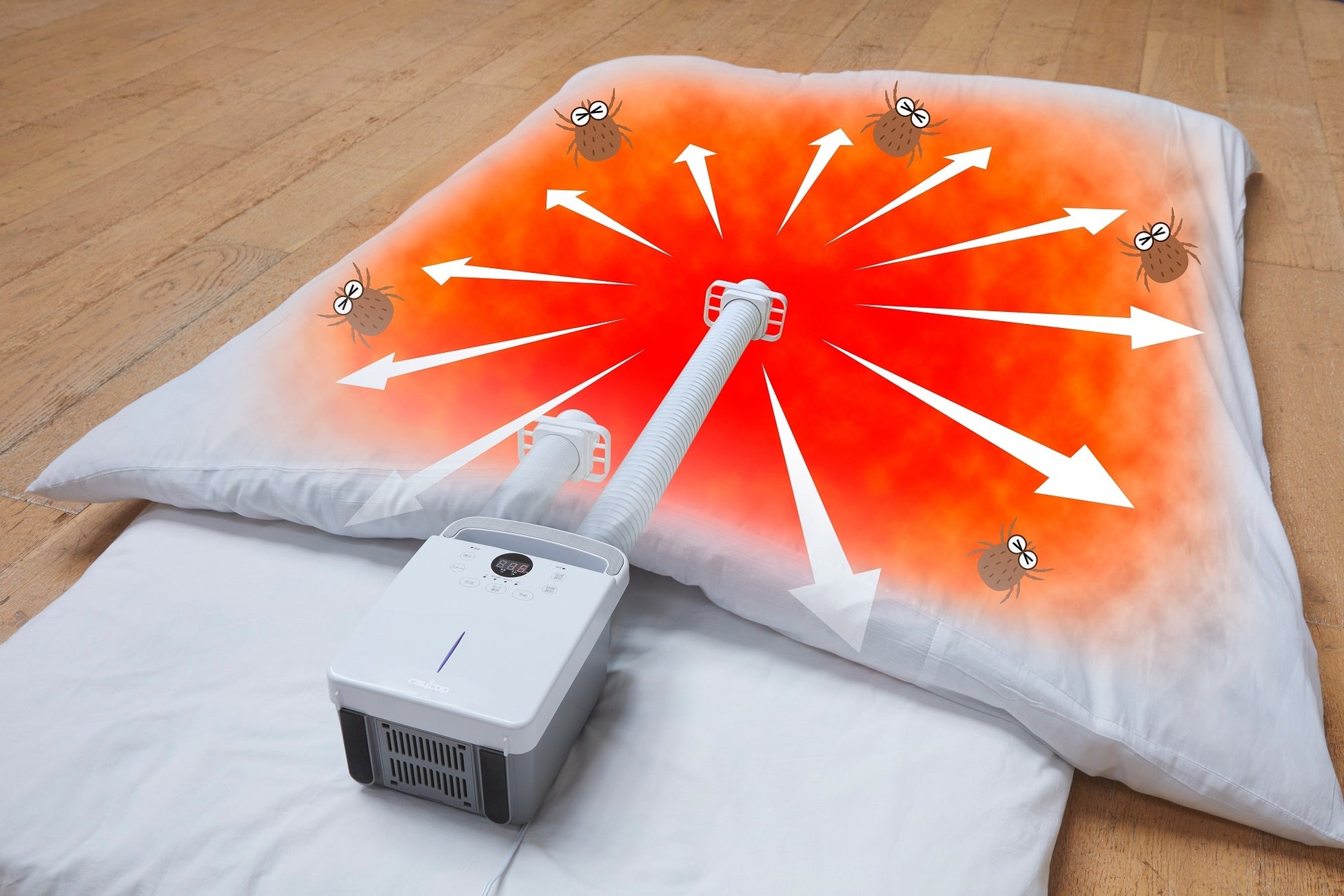 今回販売する『レイコップ ふとんドライヤー』は、ツインホースで送り込む高温風の力でダニを退治。高温多湿を好むダニの発生や繁殖を未然に防ぐことができる、レイコップ初の布団乾燥機です。