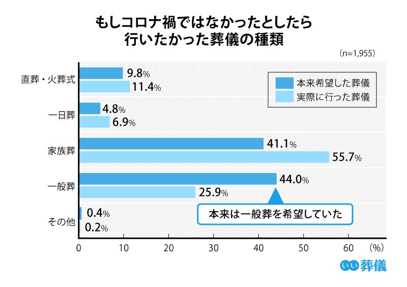 コロナ禍以降、行動の制限により企業や著名人・芸能人などの大きな葬儀が憚られる風潮が広まっています。一般の方々にとっても状況は同様で、株式会社鎌倉新書(いい葬儀)による「第5回お葬式に関する全国調査(2022年)」では、2020年に実施した第4回調査時には約半数であった一般葬(※親族以外の知人や友人・会社関係の弔問客を招いておこなう葬儀形式)がコロナ禍において減少し、小規模でおこなう家族葬が過半数以上を占めて主流となった上、直葬・火葬式を選択する方も増加していると発表しています。しかしながら、同調査では「実際には別の葬儀の形式を選んだものの、本来は一般葬を希望していた方は44%にも上ると判りました。