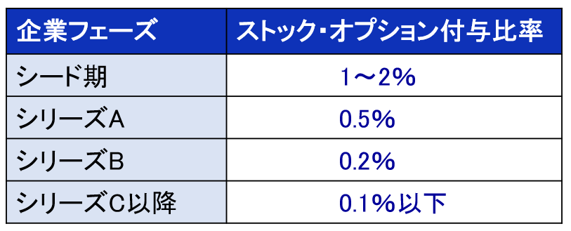 〔表2 企業フェーズ毎のストック・オプション付与比率(一人あたり)の相場〕