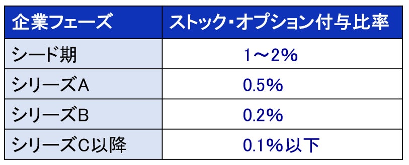 調査結果をベースに、アマテラス利用者の入社時オファー状況やプル―タス・コンサルティング社の意見も踏まえ、入社時に付与されるストック・オプション付与比率(一人あたり)は表2の通りと考えています。フェーズが進むにつれストック・オプション付与率が減少する傾向です。