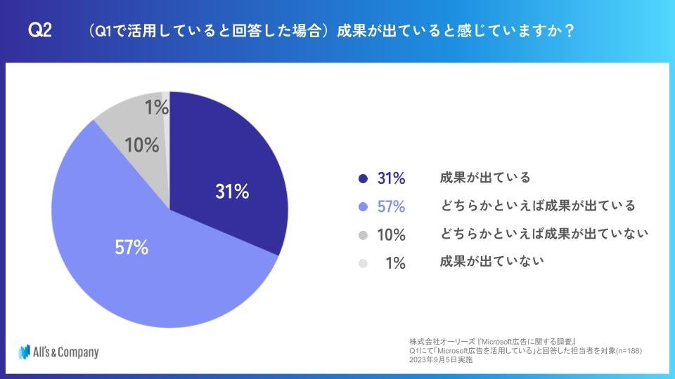 ・インターネット広告に出稿している企業の38%がMicrosoft広告を活用しており、そのうち88%が「成果を出せている」「どちらかといえば成果を出せている」と回答