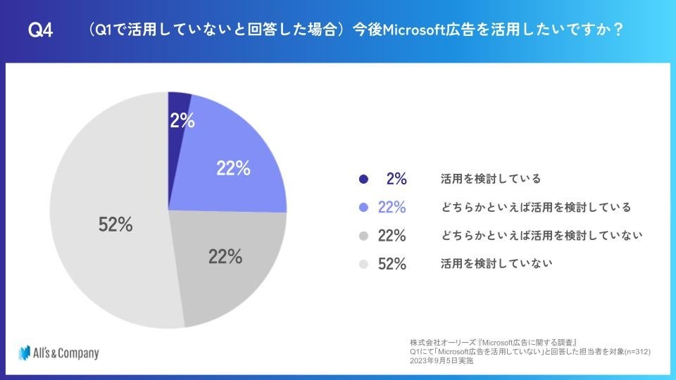 一方で、Microsoft広告を「活用していない」と回答した企業を対象に、「今後Microsoft広告を活用したいですか?」と質問したところ、「活用を検討していない」「どちらかといえば活用を検討していない」と回答した割合が全体の74%を占めました。