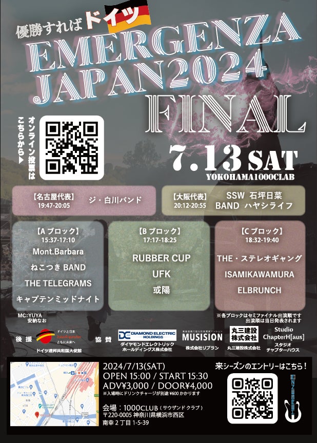 エマージェンザ・ジャパン事務局(運営:株式会社ウィンドゲート、所在地:東京都渋谷区、代表取締役:尾嵜 豪)は、日本のミュージシャンの海外進出を支援するための音楽イベント「エマージェンザ・ジャパン2024」のJAPAN FINALを開催します。今年度の大会では、横浜1000CLUB(サウザンドクラブ)にて、2024年7月13日(土)に開催されます。会場内では食べ物ブースも出店します。