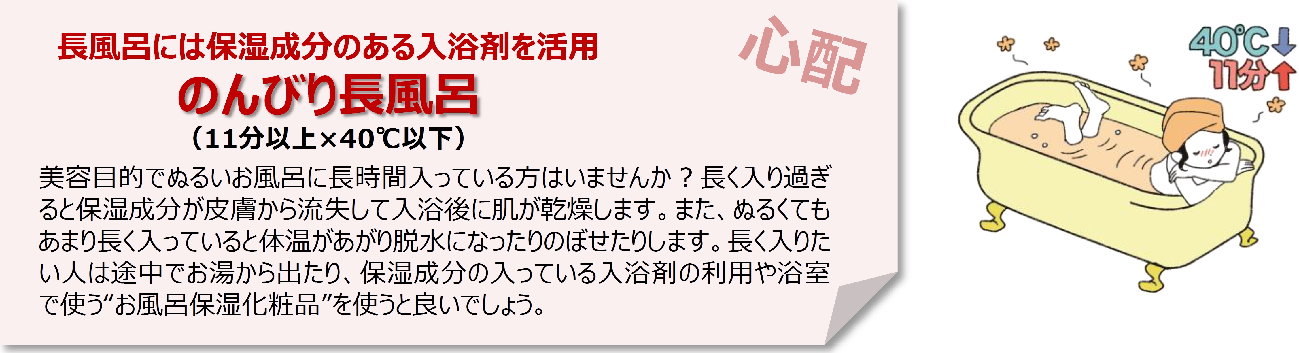 ぬる湯の方が熱い湯より保温効果が長いという実験結果もあり、“健康手抜き風呂”が冷え性へ好影響を与えていると考えられます。今回は”江戸っ子風呂”で肌の悩みが全体的に少ない傾向にありました。しかし、42℃以上ではかゆみが出る可能性もあるため、注意が必要です。また、長時間の入浴は保湿成分が皮膚から流出し、皮膚の過乾燥を引き起こしますので、“のんびり長風呂”でもっとも肌の乾燥に悩む人が多いのも、実は納得できる結果です。