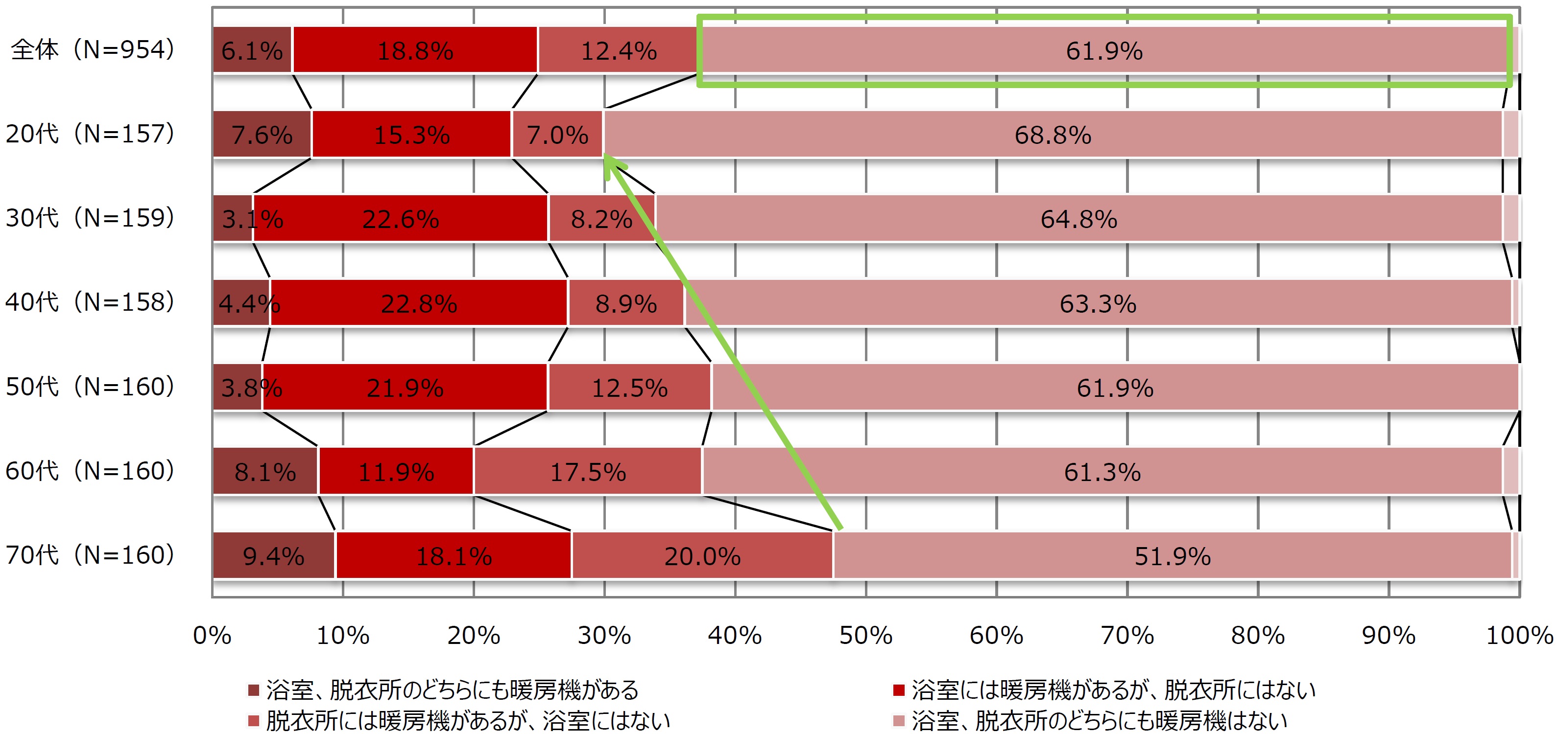 浴室ならびに脱衣所における暖房環境について伺いました。「浴室、脱衣所のどちらにも暖房機はない」と回答した人が全体では約6割という結果となりました。年代別に見ると、年代が下がるにつれて暖房機がないと回答する人が増える傾向にあり、20代では約7割にのぼりました。