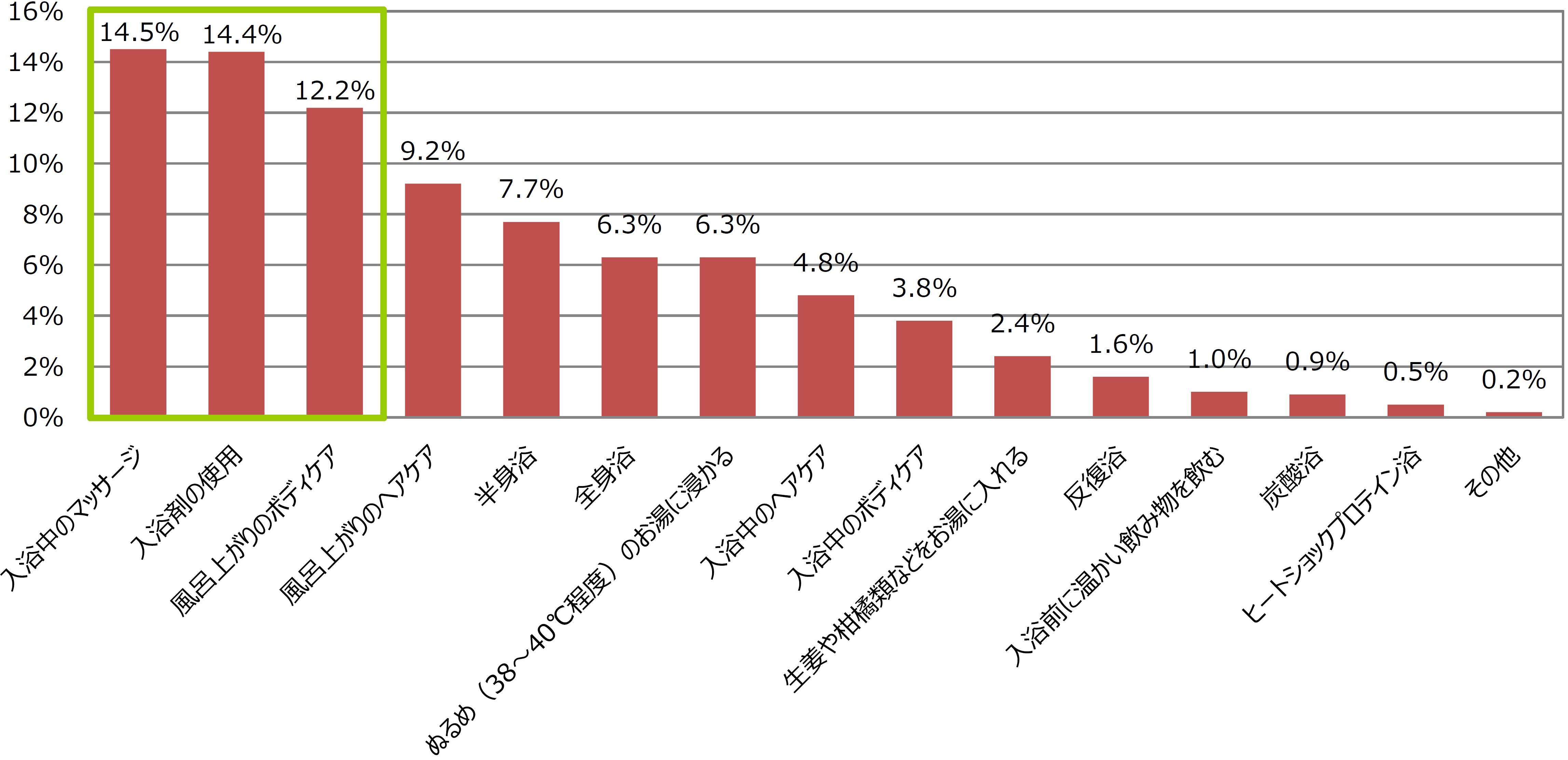 入浴中に行っている習慣を伺うと、「考えごとをする」が27.5%と最も多く、続いて「マッサージをする」、「ストレッチ・運動をする」という結果となりました。続いて、美容のために行っている入浴習慣について伺うと、「入浴中のマッサージ」、「入浴剤の使用」が最も多く、続いて「風呂上がりのボディアケア」という結果となりました。