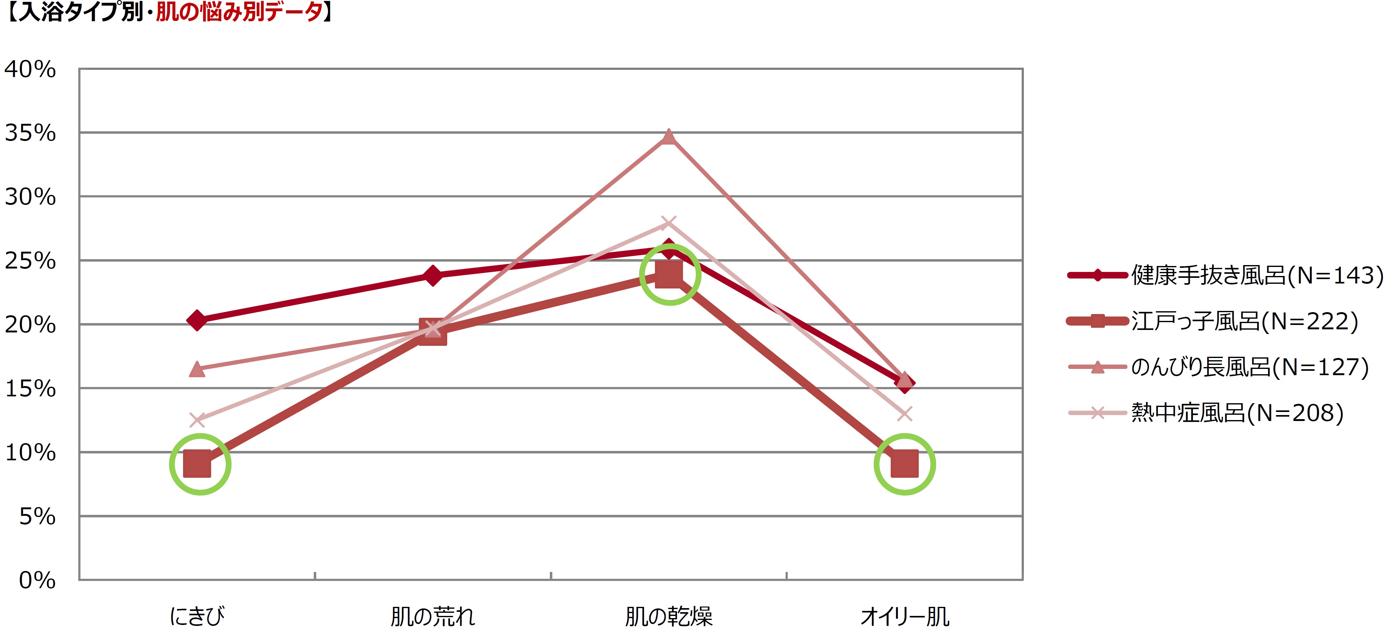 「江戸っ子風呂」の人はニキビ・肌の乾燥・オイリー肌の悩みが少ない傾向
