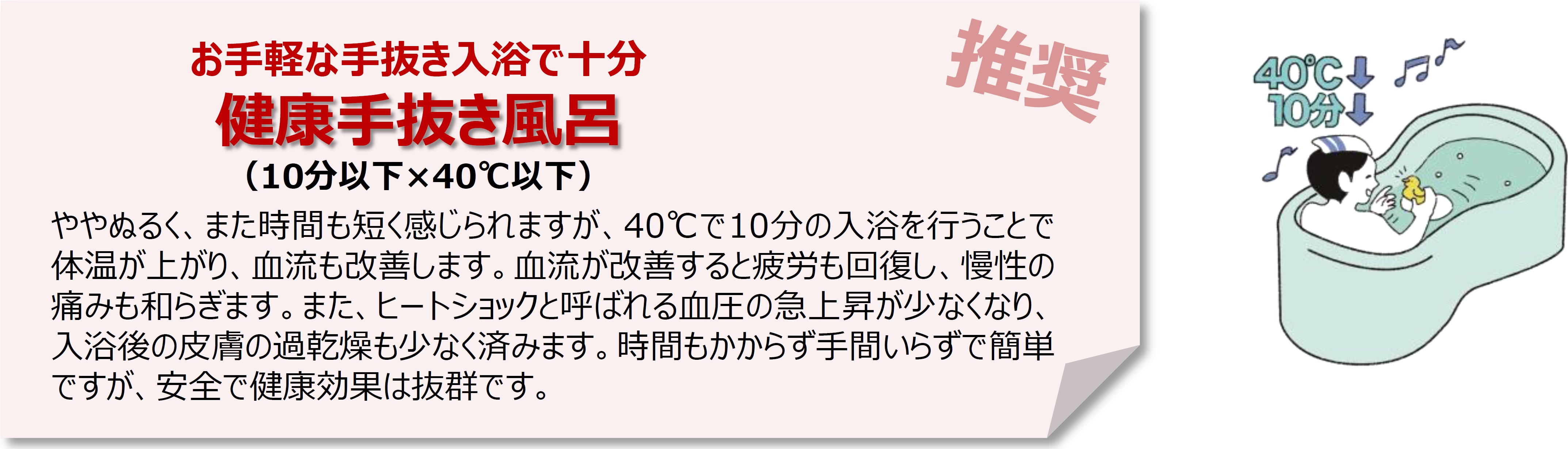 入浴時間10分以下×湯温40℃以下を安全な“健康手抜き風呂”として推奨しています。浴槽を用いた入浴というと、長い時間お湯に入らないと美容や健康効果がないのでは?と考える人が多いのですが、実際は10分以下のお手軽な“手抜き”の入浴法で十分です。この“健康手抜き風呂”を実践している人はたった2割でした。逆に全く浴槽に浸からない人も2割もいましたので、気負うことなくまずは10分浴槽に浸かってみてださい。高温の湯や長時間の入浴はのぼせやヒートショックの危険があります。