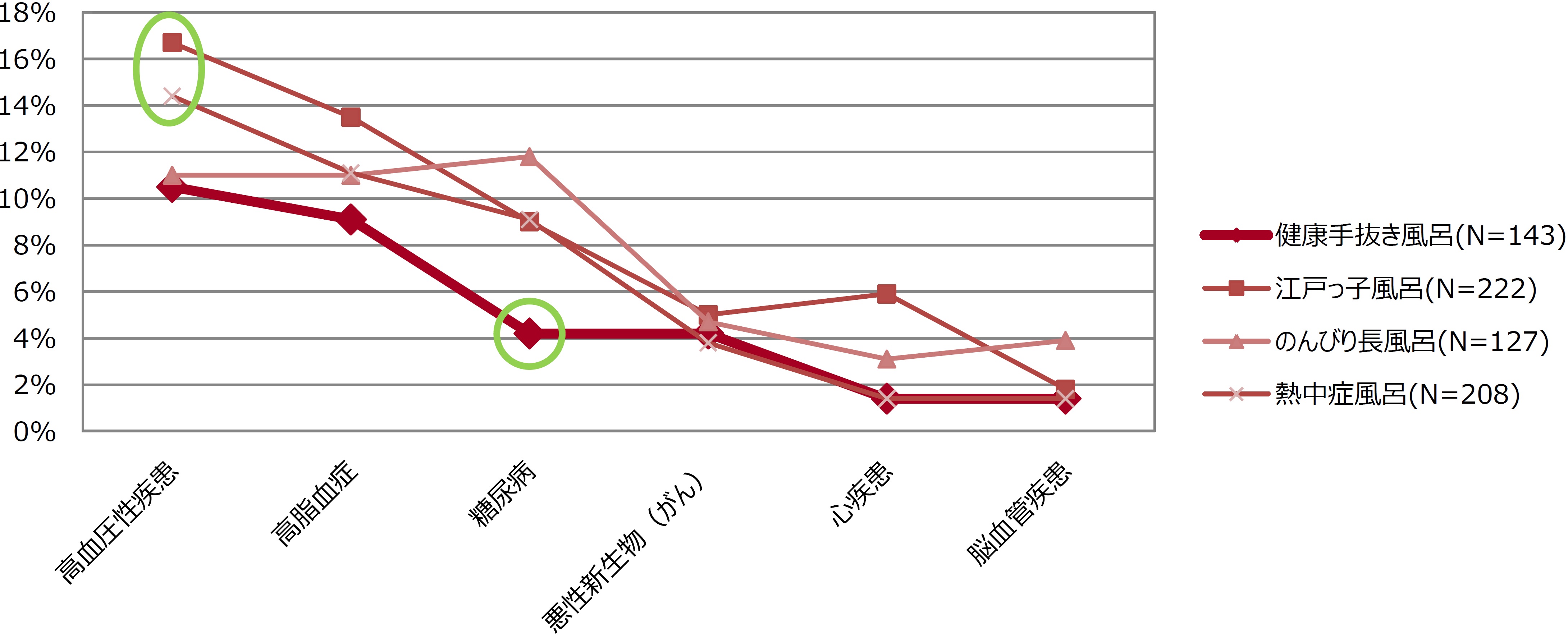高血圧と診断されたことが多いのは「江戸っ子風呂」・「熱中症風呂」