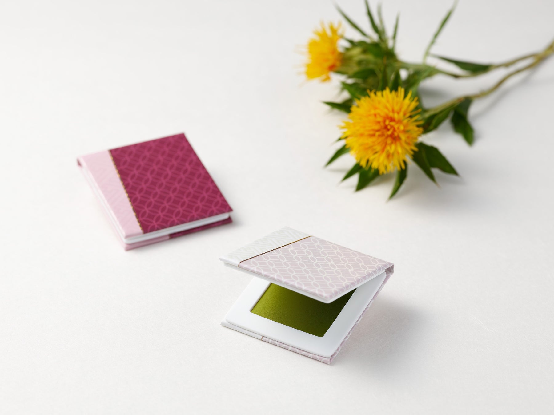 小町紅は、紅花の花びらから、江戸時代より当社が守り続ける秘伝の製法で赤色の色素を抽出して手づくりされる100%天然色素のコスメです。かつて芝居見物や物見遊山など外出時の化粧用として、名刺入れサイズ程の紅の薄型容器・紅板(べにいた)が携行されていました。この度、現代版の軽い紙製の紅板に、平安王朝の貴族達が衣装に取り入れ季節を繊細に表した「かさね色」を展開した5種の小町紅が登場します。