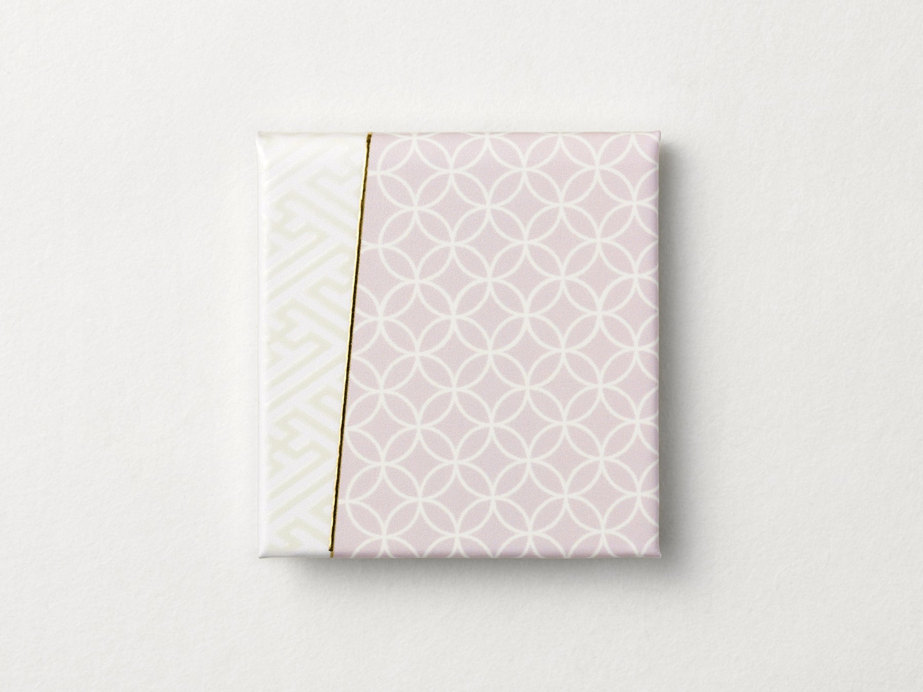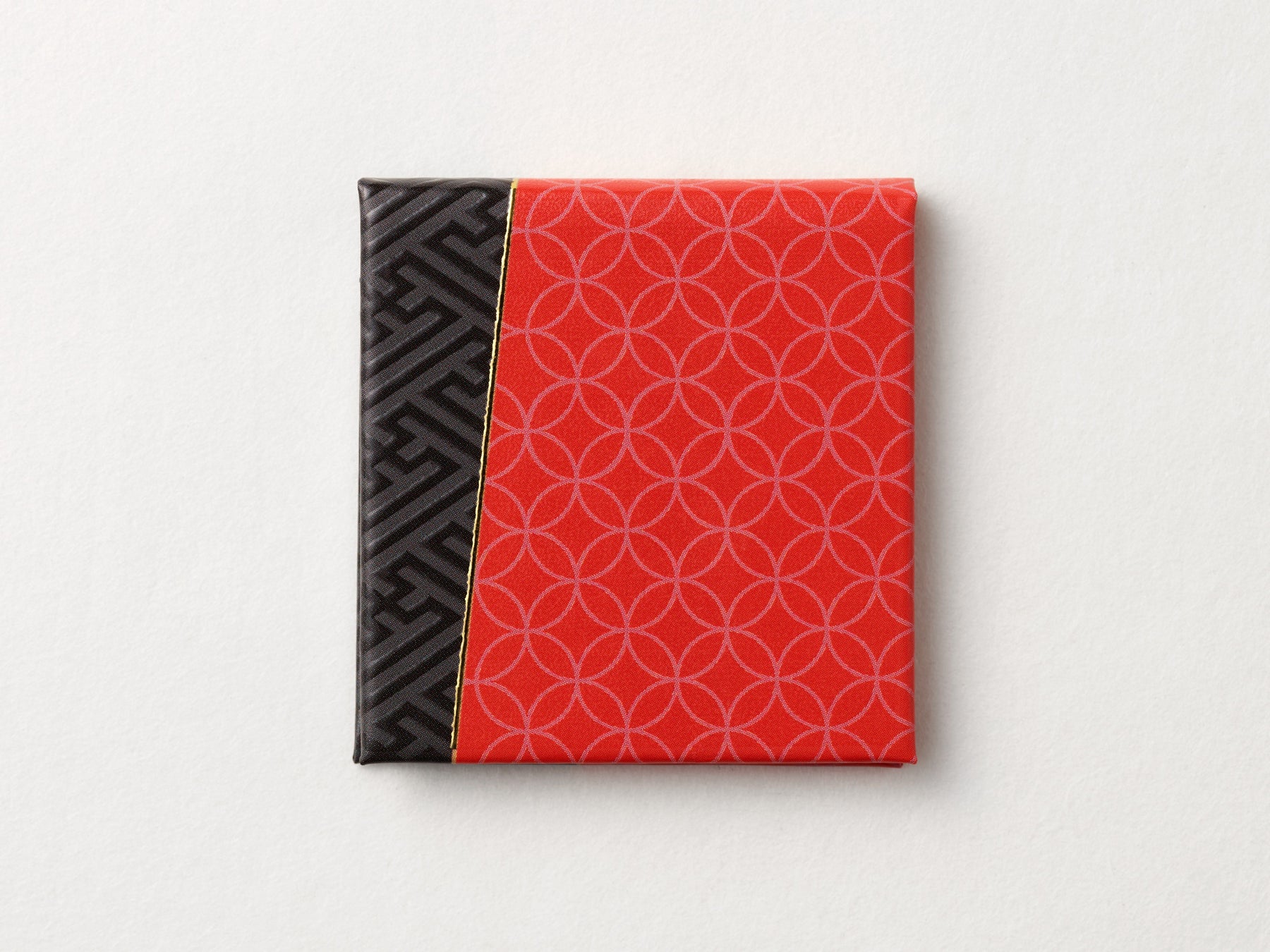 春・夏・秋・冬。日本の四季を切り取った色彩や、古来、化粧に使用されてきた色彩を、片身替り(かたみがわり)という、模様や色合いなどを左右またはひと幅ごとに異なった裂(きれ)で仕立てる手法にならって組み合わせました。文様は、縁起の良い「紗綾(さや)柄」と「七宝文」を左右に合わせて、古くは破邪退魔のいわれを持つ紅がお守りのように持ち歩けます。