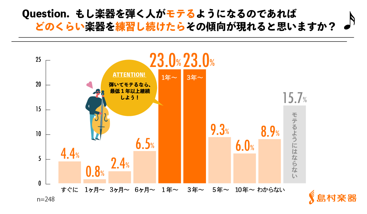「もしモテるとしたら人に聴かせられるようになってからだと思うので、少なくとも1年はかかる。」「早い方だと3ヶ月前後くらいで簡単な曲が弾けるようになりますが、1年くらいあると「弾けてる」感が出て来て、その自信は立ち振る舞いにも出てくる」「1年でいきなり上達する人もいますが、フレーズやプレイに表情・個性が出るには平均的に3年くらいかと」など、楽器の種類や練習頻度にもよるが1年または3年程度継続すると周囲にも変化が感じられる、という結果となりました。