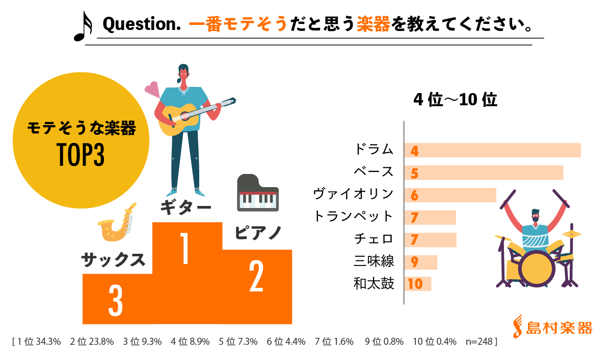 第1位【ギター】34.3% 第2位【ピアノ】23.8% 第3位【サックス】9.3%