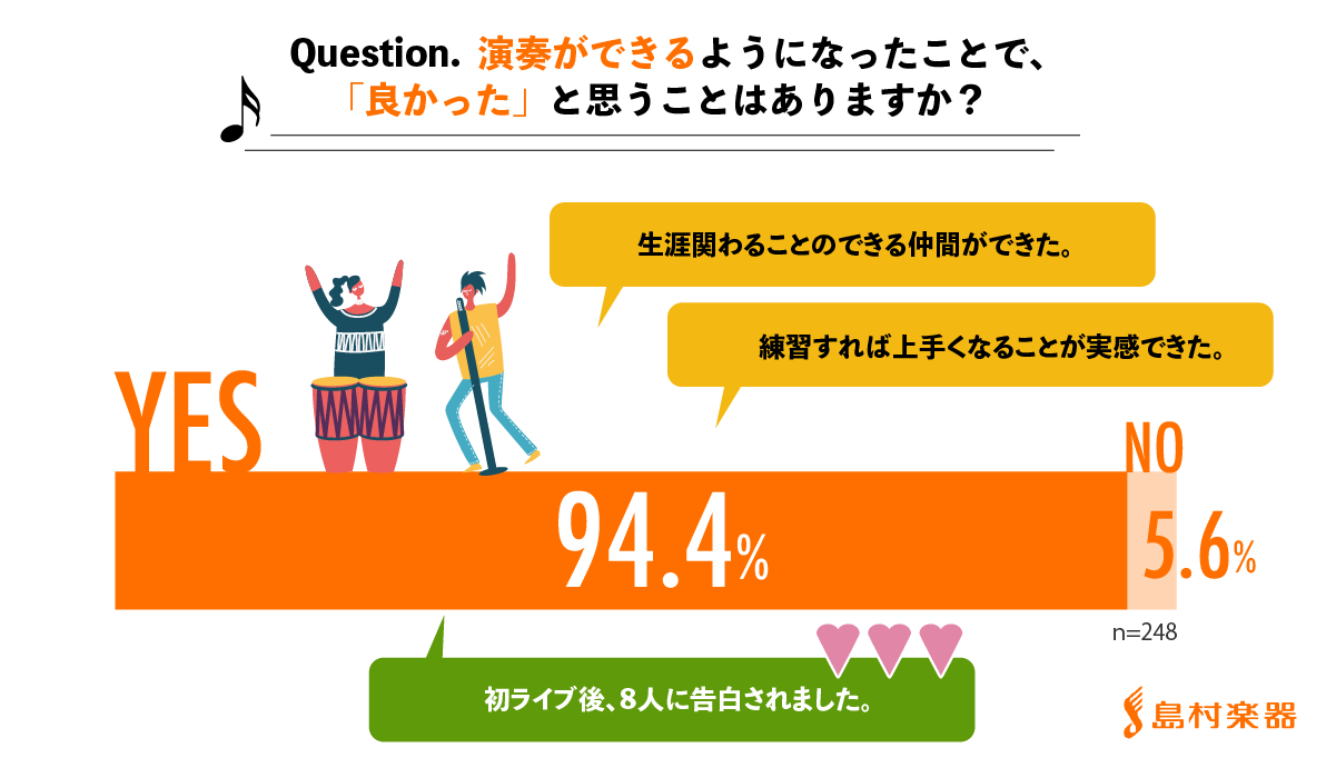 ◆ 楽器を演奏できるようになって良かったと感じる人は94%超!