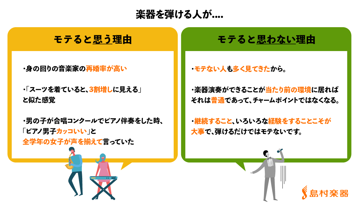 - モテない人も多く見てきたから。楽器の演奏ができることが当たり前の環境にいればそれは普通であって、チャームポイントではなくなるから。