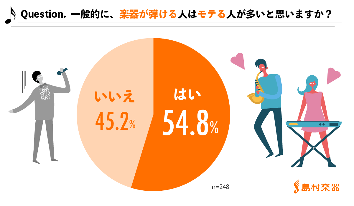 【島村楽器調べ】島村楽器従業員に聞く、楽器とモテに関する意識調査/楽器を演奏できると「モテる」と感じる人は54.8%「良い影響」を実感している人は94.4%!
