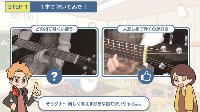 「ギターセンパイ」は、初心者が飽きてしまいがちな単調な基礎練習はあえて行わず、最新の人気曲にあわせて弾いているうちに上達でき、初心者がつまづきやすいポイントに対するアドバイスも提供しています。