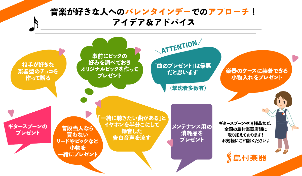 音楽が好きな人にバレンタインデーにアプローチする時、良いアイデアがあれば教えて下さいという質問には、楽器店に勤務し様々な演奏者と接してきた経験からのアイデアが寄せられました。