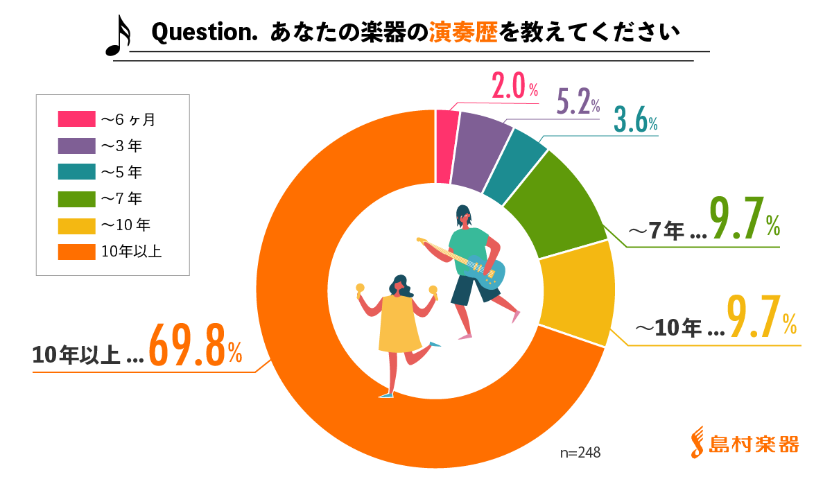 ※ 調査対象者の約7割が10年以上の楽器演奏経験あり