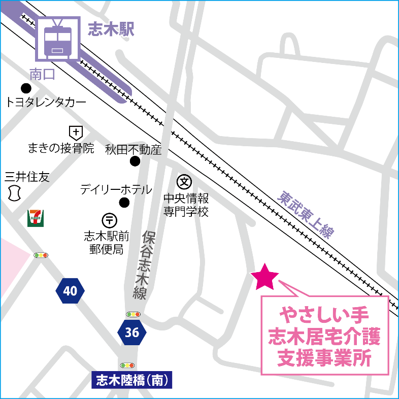事業所は志木駅から徒歩6分の駅前商業施設に隣接する落ち着いた住宅街に位置し、周辺には総合病院やクリニックなどもあります。