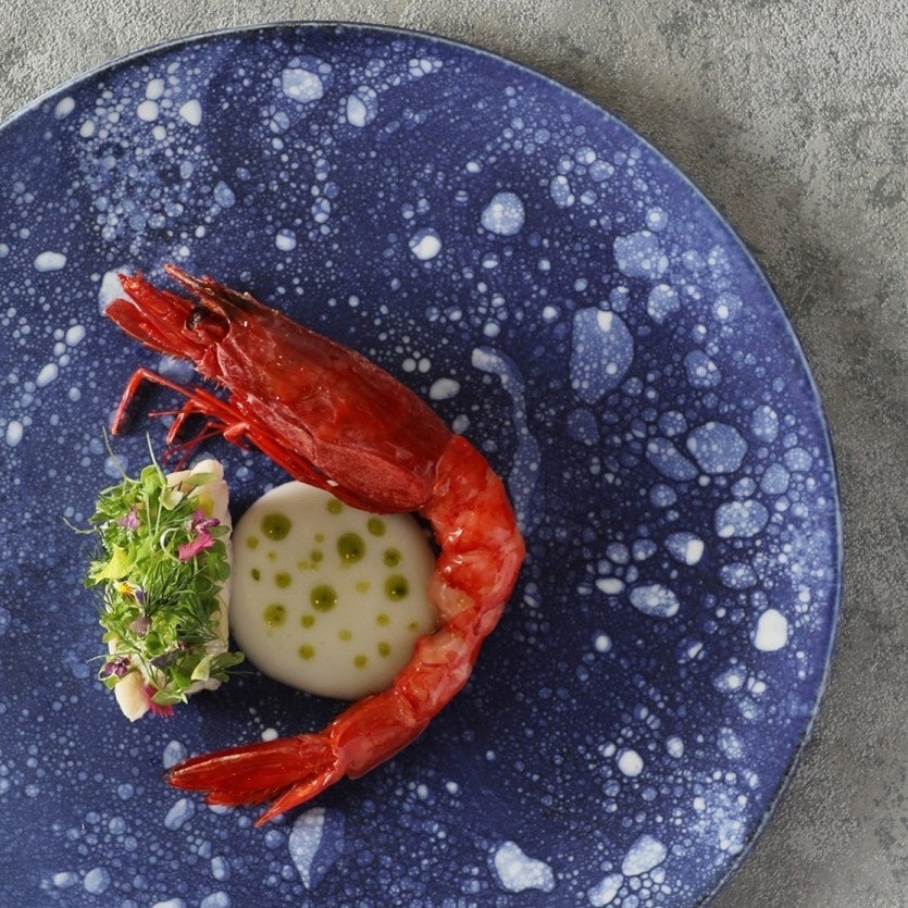 生きた状態で鮮やかな紅色をしているため「赤い悪魔」とも呼ばれる高級海老のカラビネーロを真っ赤な鬼に見立ててポアレにした一品です。濃厚な海老味噌と白ワインのソースにはアクセントに香草オイルを添えました。食べ応えのあるぎっしりと詰まったプリプリの身の食感をお楽しみください。