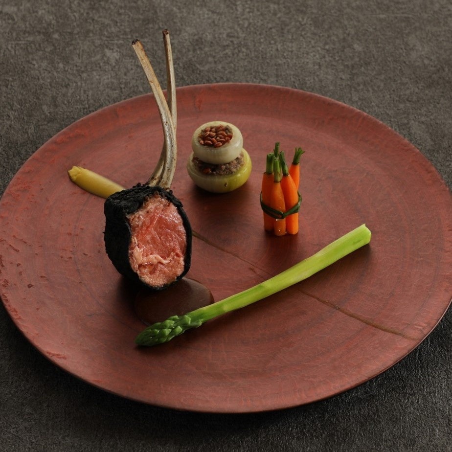 たくましくそびえ立つ角が印象的な子羊のローストは、竹炭をまとわ せて力強い鬼のイメージで仕上げました。玉ねぎに詰めた岡山県総社産の赤米とシャンピニオンのリゾットは、大小2段に重ねることで鬼ノ城をイメージ。さらに、盛り付けにもこだわり、弓矢をイメージたアスパラやとうもろこしのピューレを添えました。力強いインパクトがありながら、やわらかな肉の旨味をしっかりと感じられる一皿です。