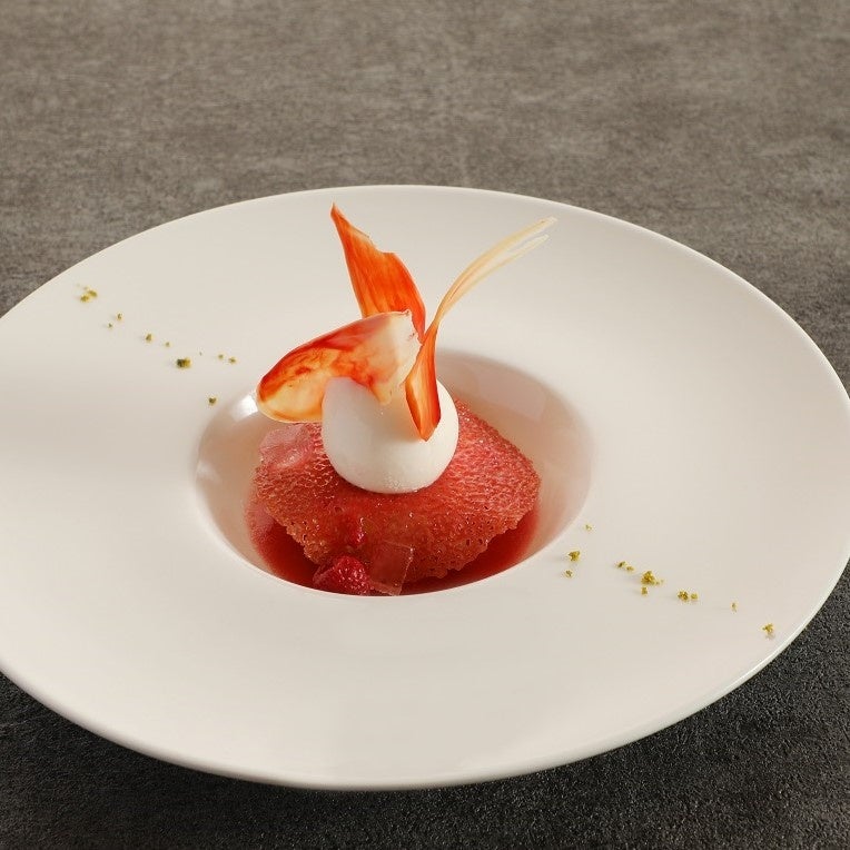 桃太郎のセカンドストーリーとも呼ばれる、「温羅の首を埋めたと伝えられる御釜殿の釜の下から世の中の吉凶を示す」様子を表現したデザート。フラムはフランス語で「炎」という意味で、釜の中で炎が燃える点をイメージしました。ホワイトチョコと赤色のカカオバターを使用した華やかなチョコ細工に、パリッとした食感が楽しめるラズベリーのチュイル、まろやかな白桃とベリーのソースなどで燃え盛る炎の「赤」を表現しました。白桃の上品な甘さが引き立つムース、と合わせて全体の素材が奏でるハーモニーをお楽しみいただけるこの時期だけのデザートです。