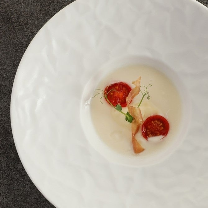 今が旬の岡山を代表する総社白桃を贅沢に使用した優しい甘さのスープに、滑らかなクリームチーズとハモンセラーノを合わせ、塩味と甘味が絶妙に合わさる上品な冷製スープです。この時期だけの芳醇な桃の香りと、スペシャルな旬の味わいをぜひご堪能ください。