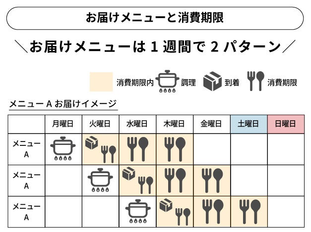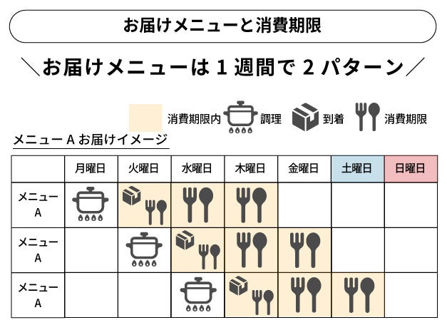「火曜日・水曜日・木曜日」お届けのメニューと「土曜日・日曜日」お届けのメニューは異なります。