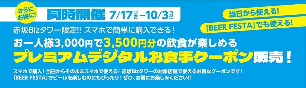 「世界を味わうBEER FESTA」期間中、お一人様3,000円で3,500円分の飲食が楽しめる、赤坂Bizタワー限定の「プレミアムデジタルお食事クーポン」を販売